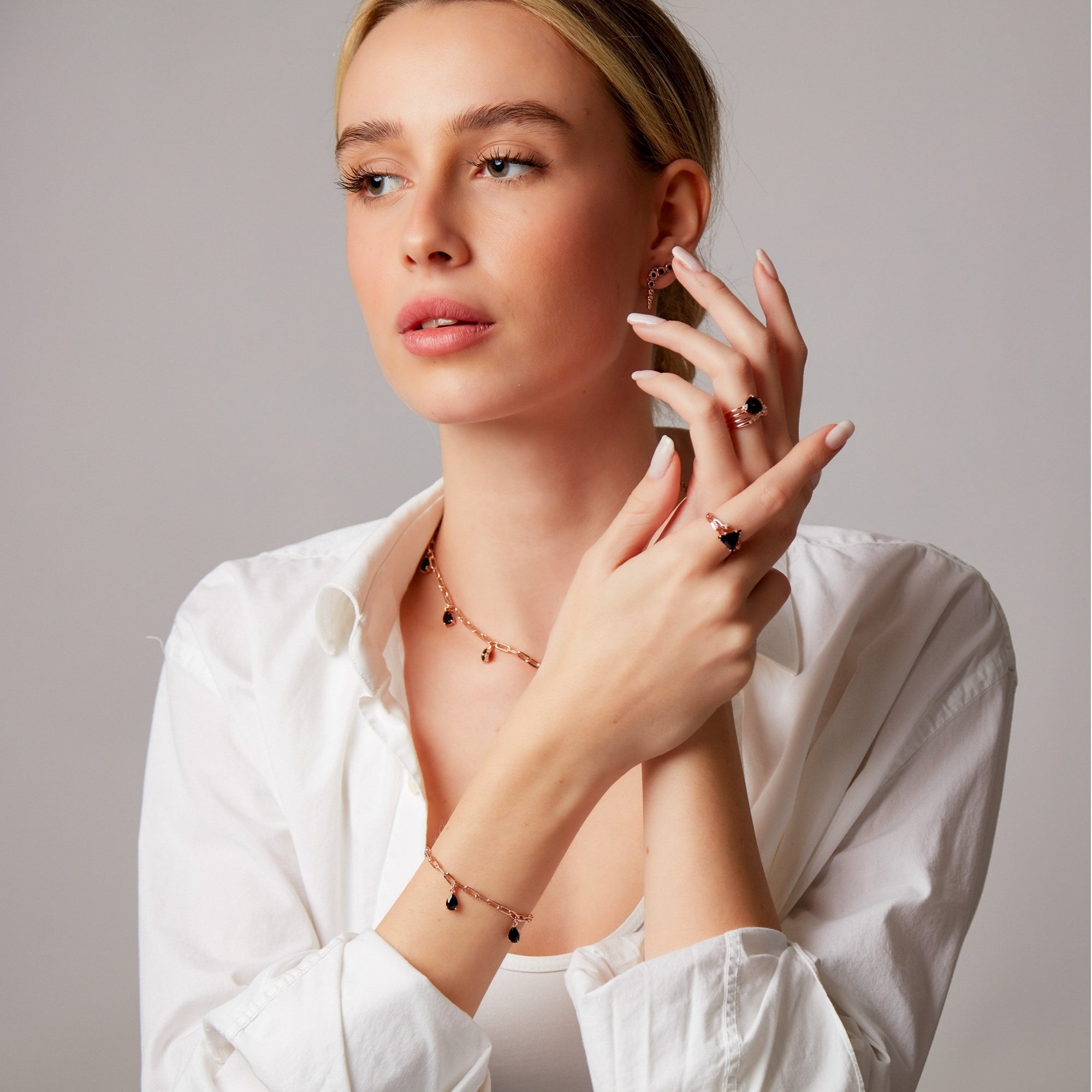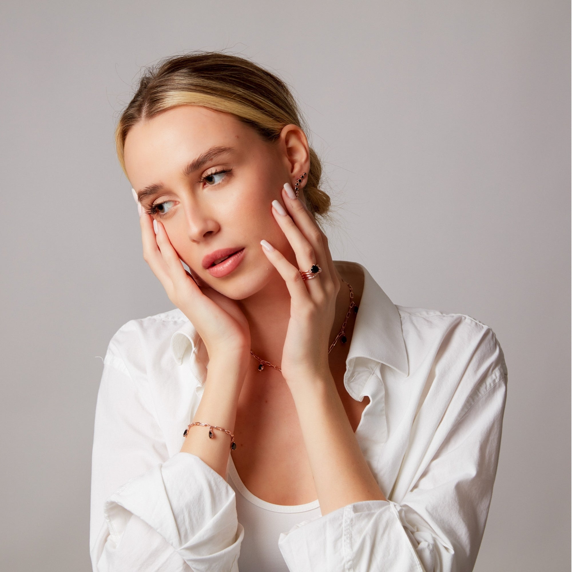 Cerceii "Noura" impresionează prin designul lor delicat, inspirat de picăturile de ploaie ce se preling pe lobul urechii. Onixul negru natural adaugă un contrast sofisticat, creând un efect vizual dramatic și unic. Placarea cu aur roz de 18k, realizată conform standardului francez "Vermeil", le conferă o strălucire caldă și subtilă, perfectă pentru orice ocazie.
