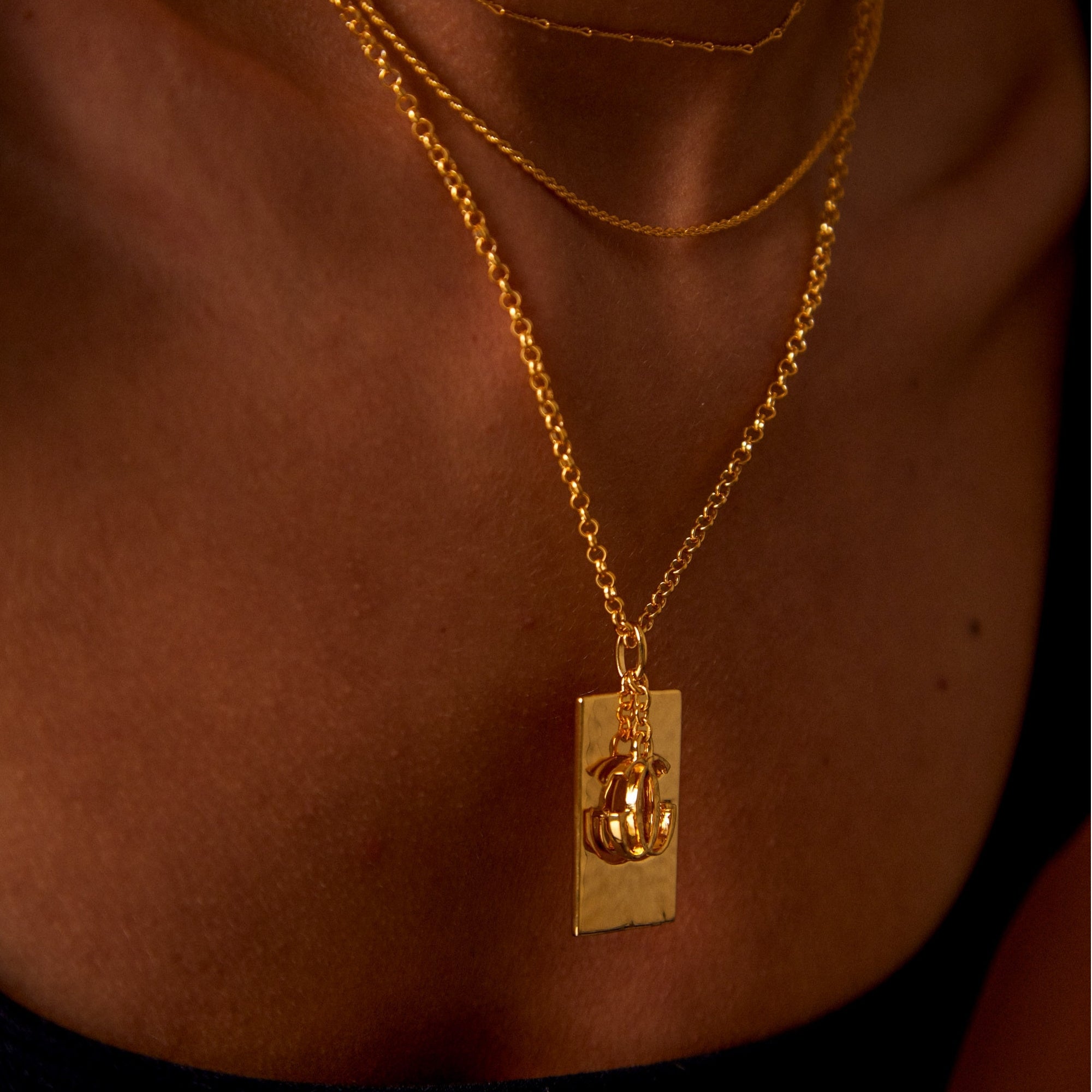 Acest pandantiv iconic, având ca piesă centrală emblema Casei GERVAIN, este un accesoriu statement care adaugă o notă de eleganță fiecărui look. Poate fi purtat singur sau combinat cu unul sau mai multe coliere lanț, creând astfel un efect sofisticat și personalizat. Placarea cu aur galben de 18k, conform standardului francez "Vermeil", îi conferă un finisaj luxos și rezistent.
