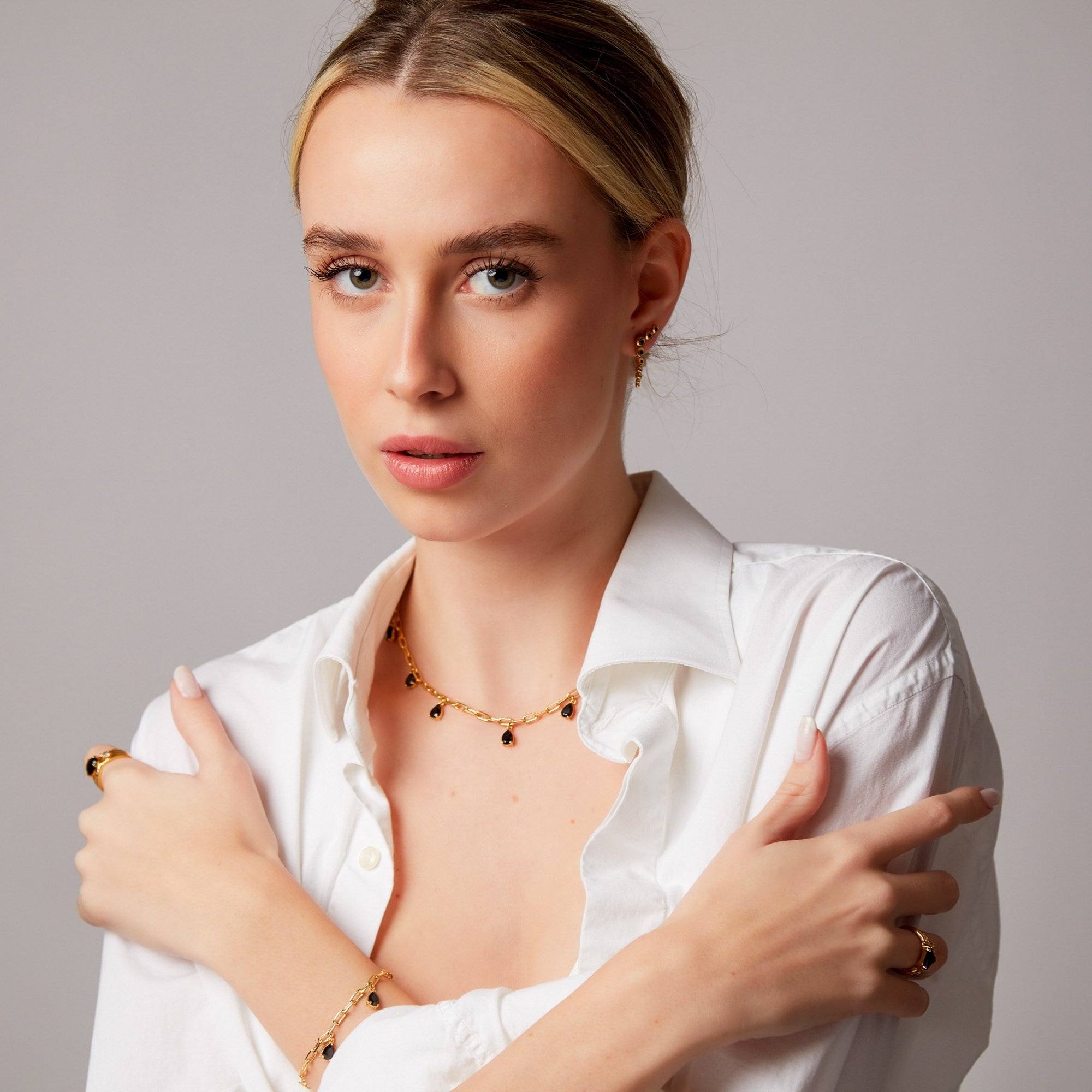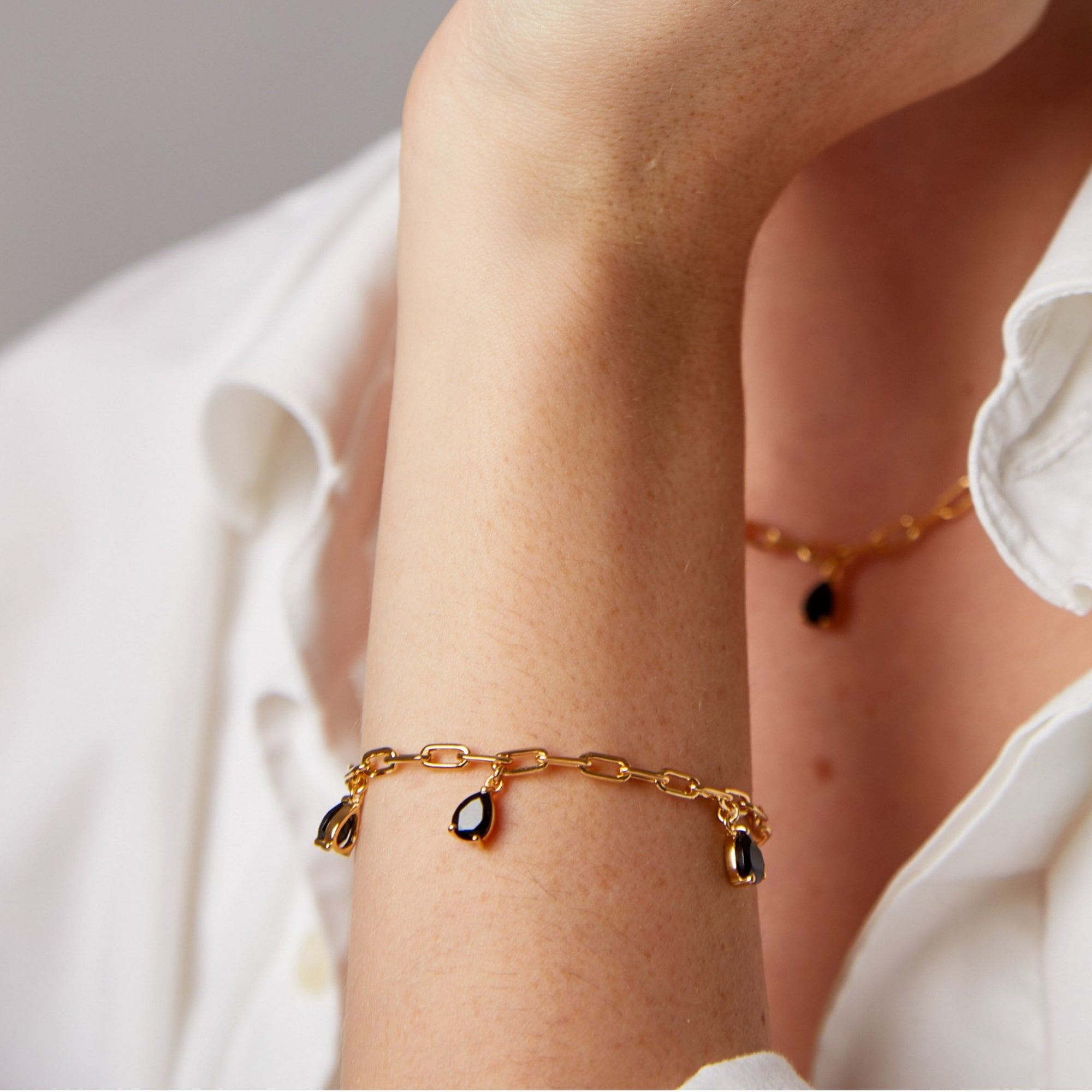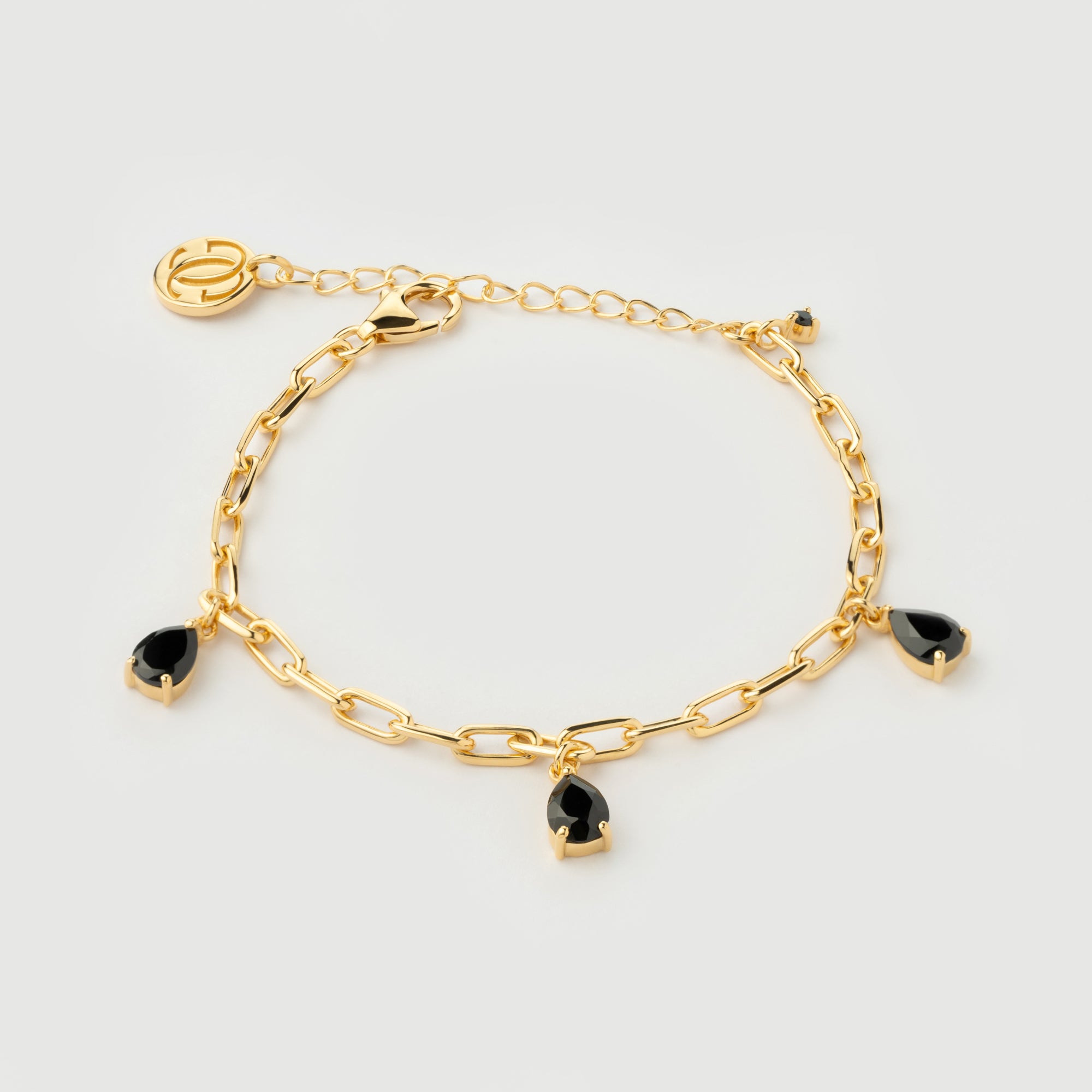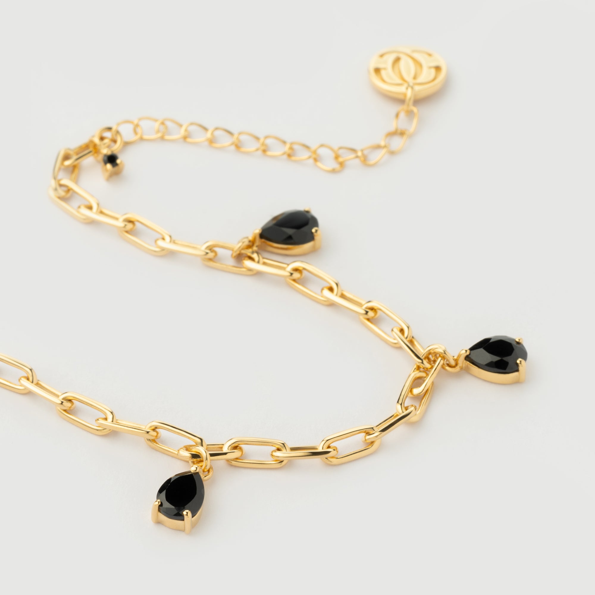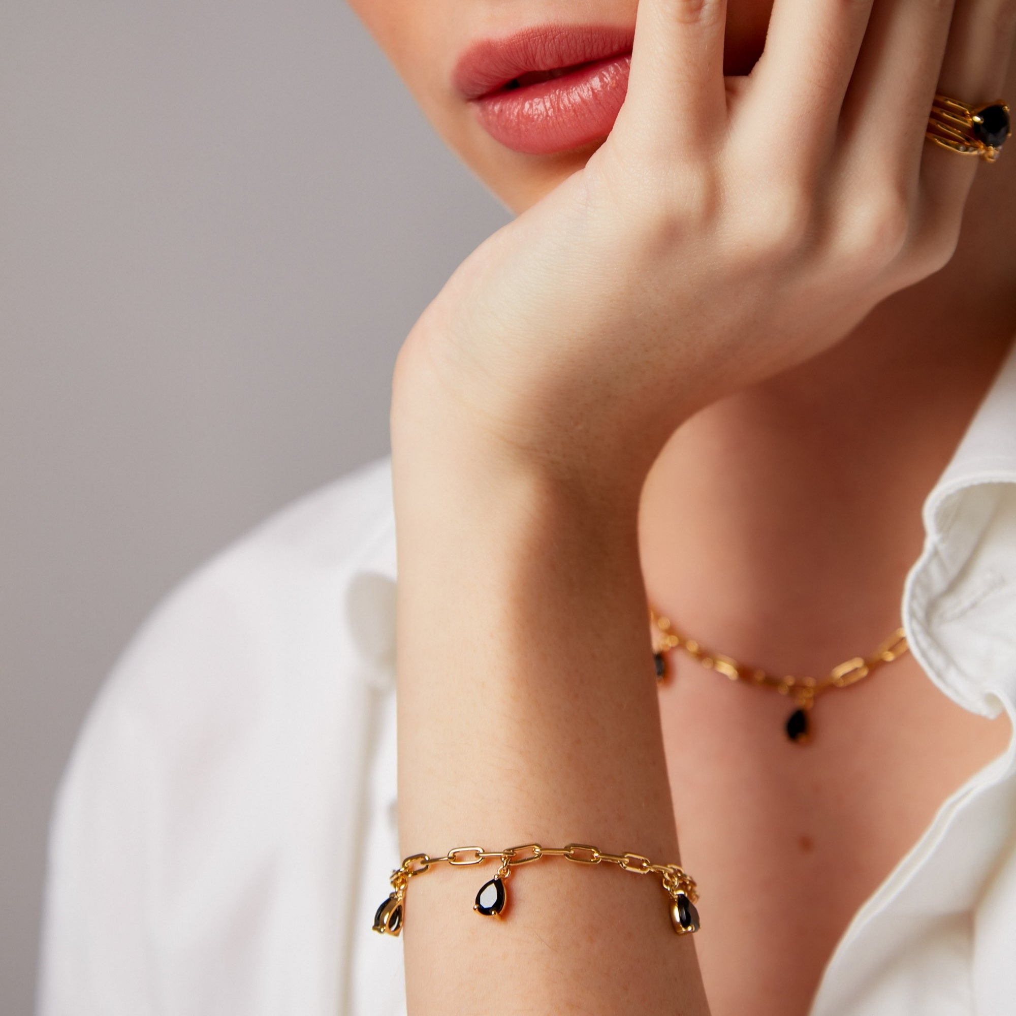 The "Haze" Yellow Gold Bracelet with Natural Black Onyx fascinates with the play of its sparkles, which vary according to the light, attracting attention in any context. Decorated with natural black onyx, this elegant and mysterious piece offers a refined contrast, ideal to complement any outfit, from casual to special occasions.