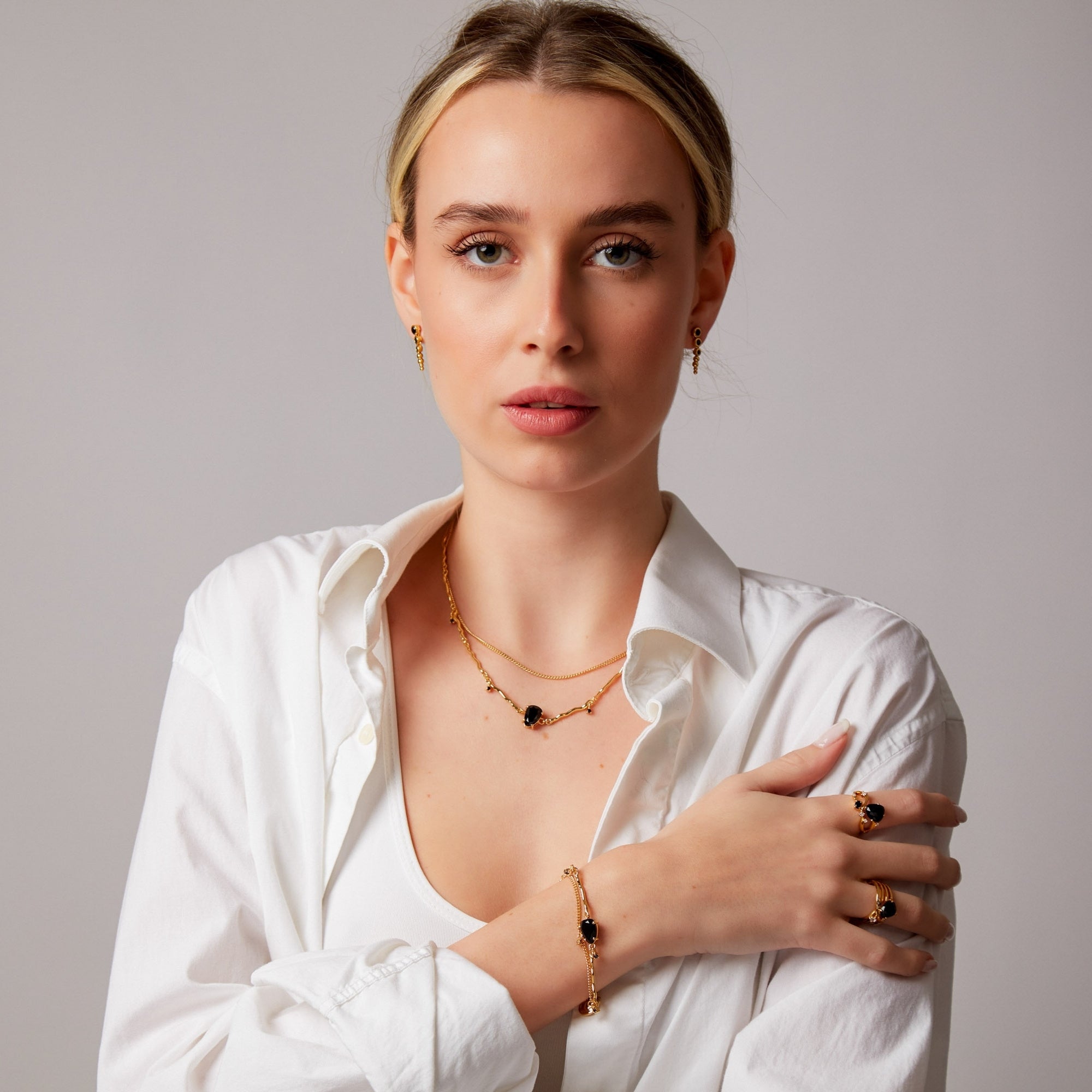 The "Hera" Yellow Gold Bracelet with Natural Black Onyx is a remarkable accessory, which highlights the elegance of the natural black onyx and the complex structure of the metal. Carefully selected stones emphasize the sophisticated design, making this piece a perfect choice for special moments. Together with the necklace from the same collection, the bracelet forms a perfect set, ideal for an unforgettable evening.