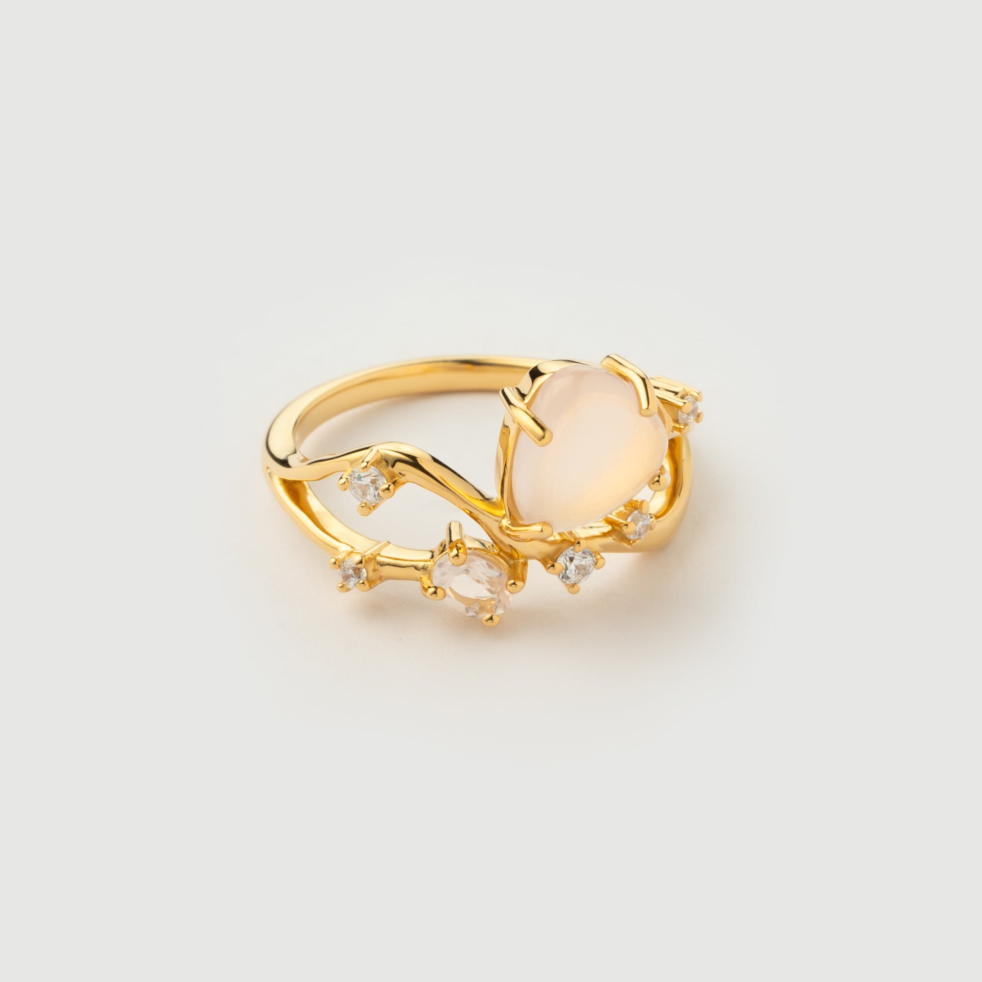 The "Hera" Yellow Gold Ring with Natural Rose Quartz is a fairy-tale jewel, with a complex design that seems to have come out of a fantastic world. Its unique shapes blend harmoniously, creating a perfect symbiosis that hugs the finger gracefully. Decorated with natural rose quartz, this ring adds a delicate touch of sophistication. Plated with 18k yellow gold according to the French "Vermeil" standard, the piece offers a balance between beauty and durability.