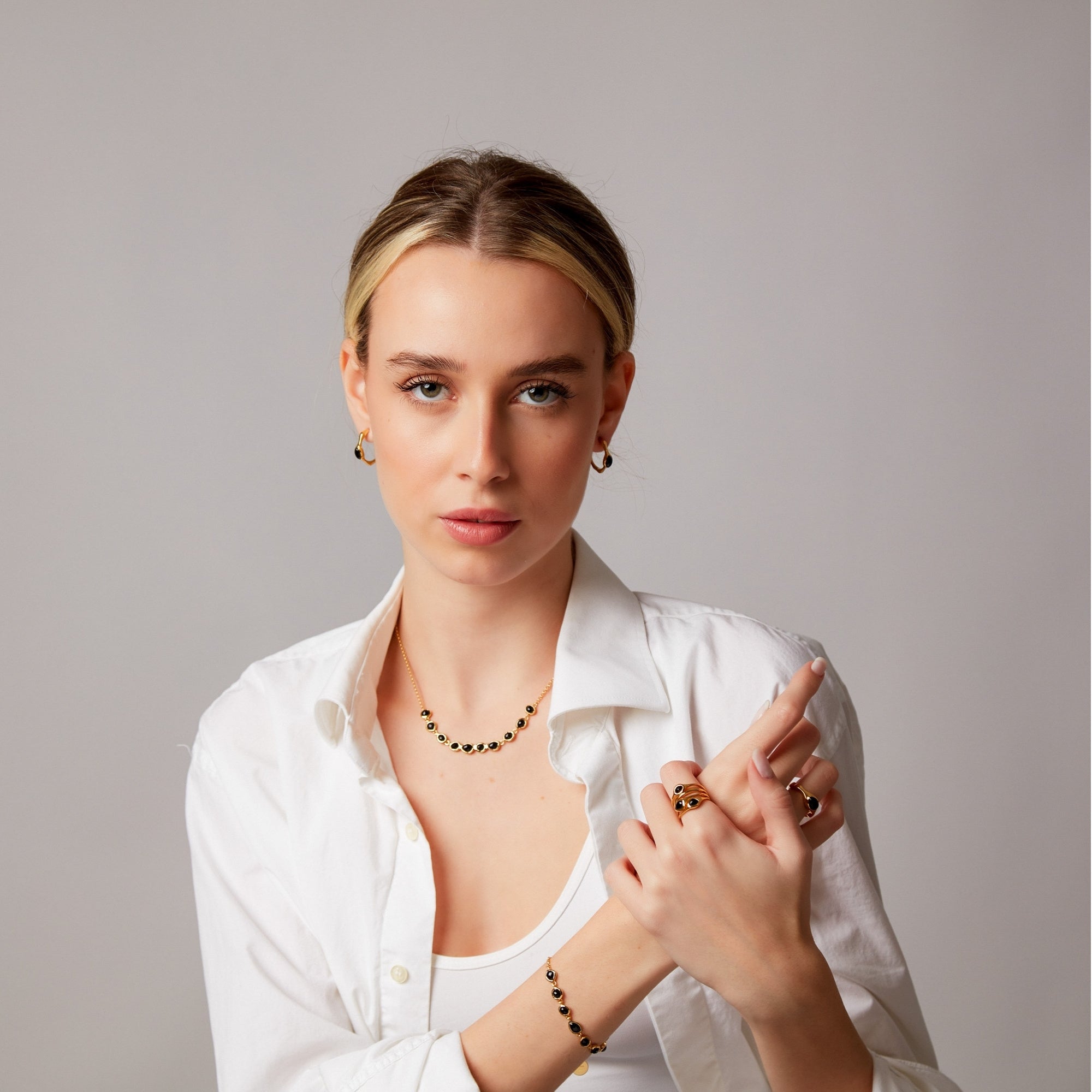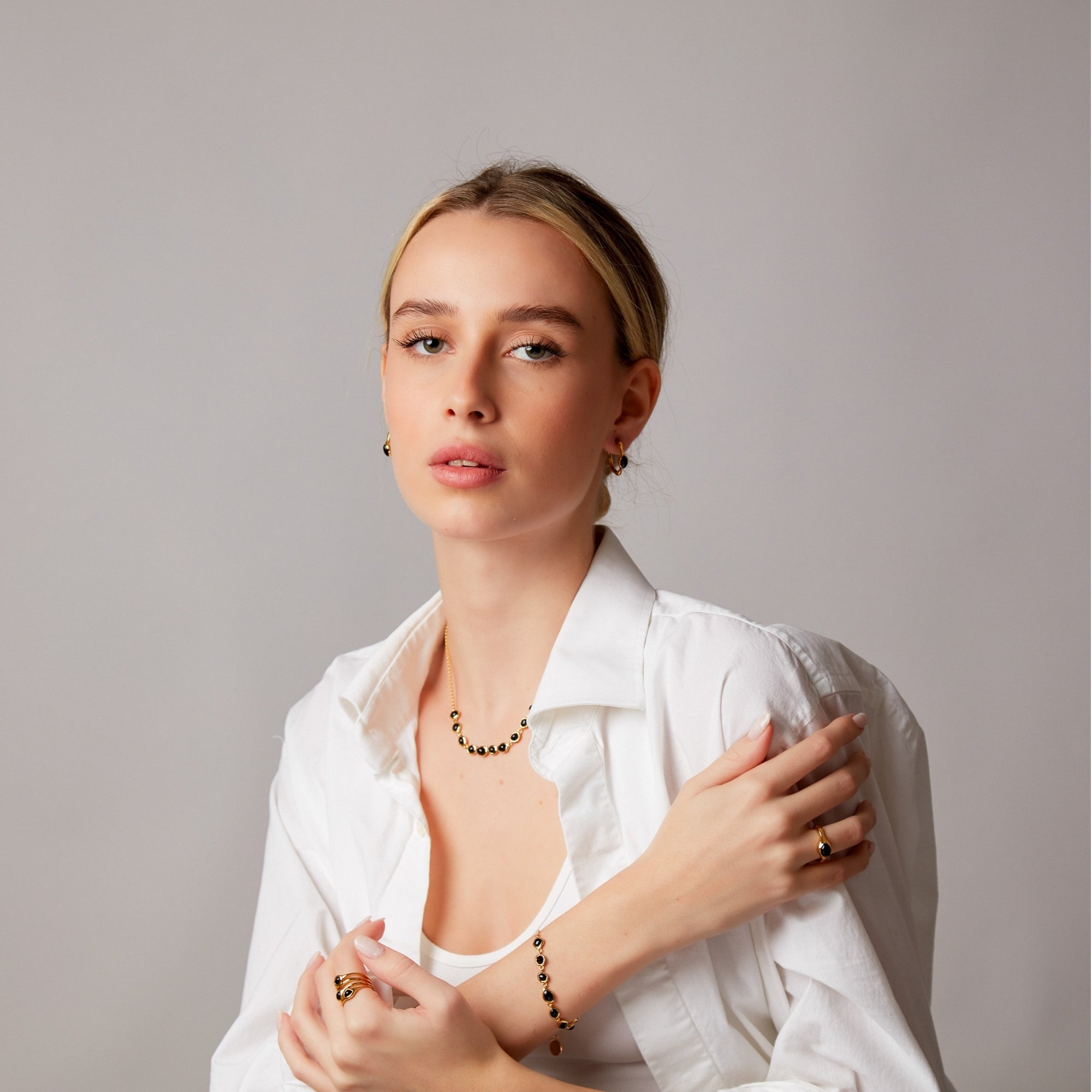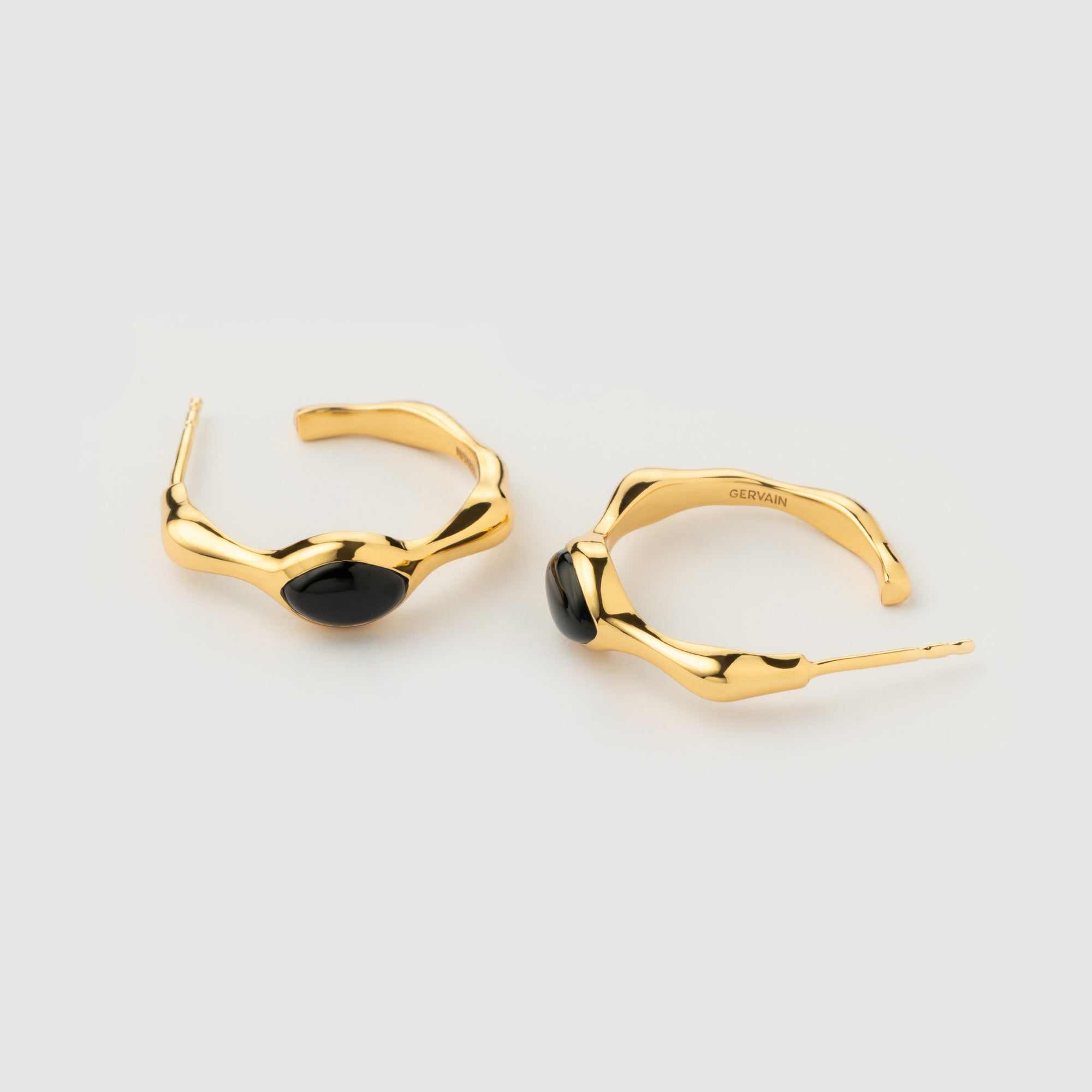 The "Lima" Yellow Gold Earrings with Natural Black Onyx impress with their spectacular design and organic shapes, which inspire tranquility and inner peace. The natural black onyx with its deep luster adds an elegant contrast, turning these jewels into remarkable accessories. The 18k yellow gold plating, according to the French "Vermeil" standard, gives them a luxurious look and superior quality.