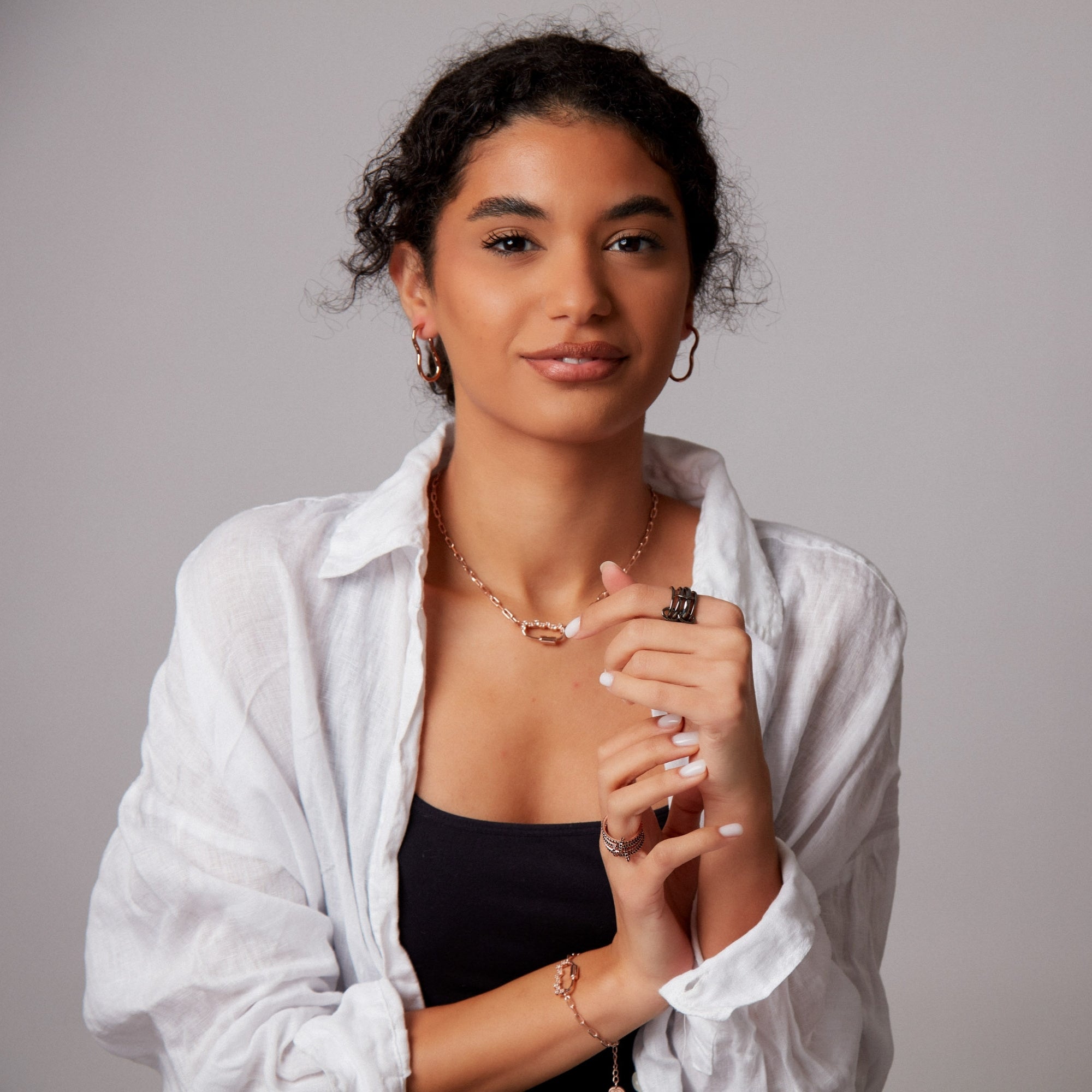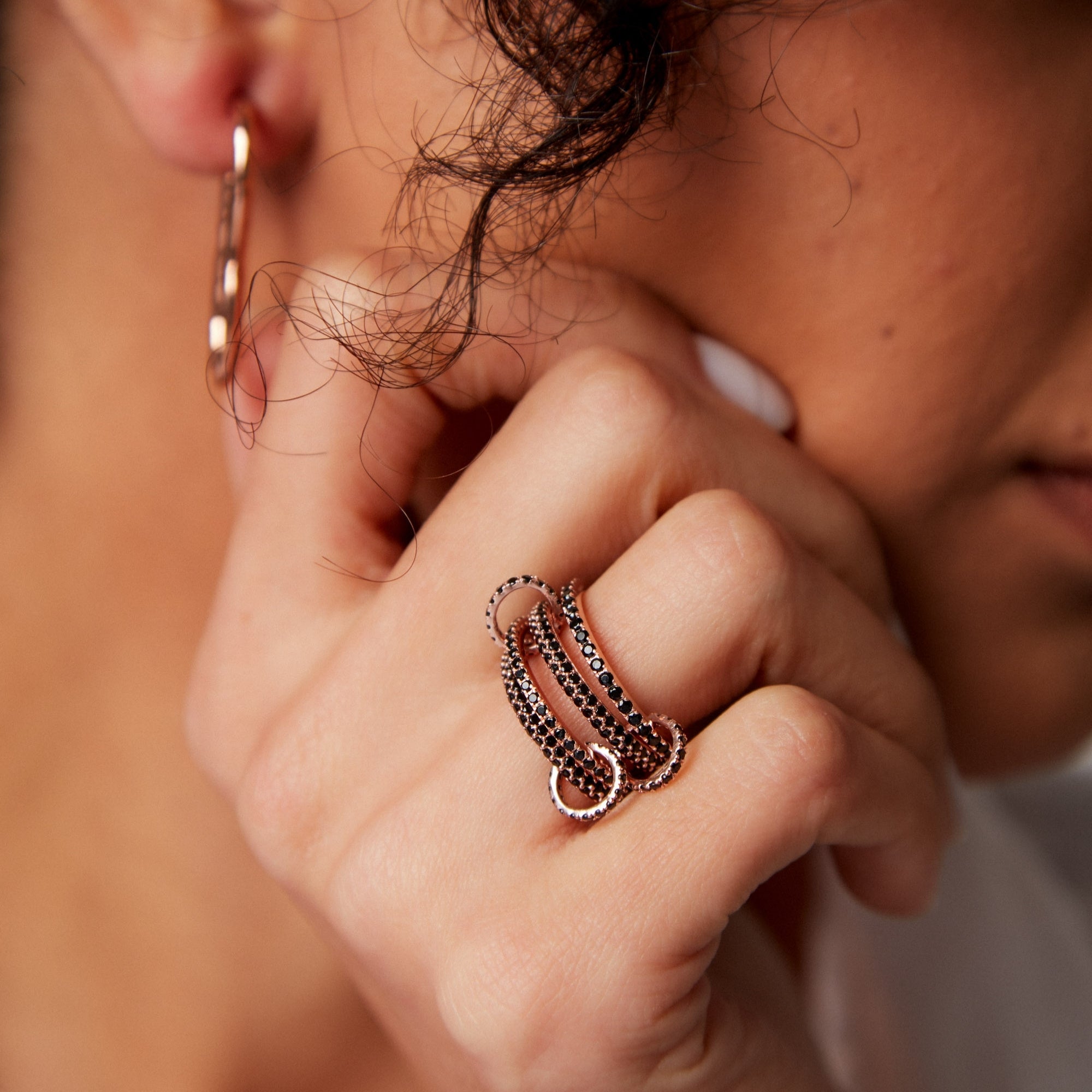 The limited series "Linkz" Rose Gold Ring with Natural Black Spinel is a special piece that combines modern elegance with a bold design. Plated with rose gold, the ring highlights the intensity of the natural black spinel, creating a sophisticated and unique contrast. The interconnected shapes and carefully crafted details transform this jewel into a statement accessory, perfect for attracting all eyes.