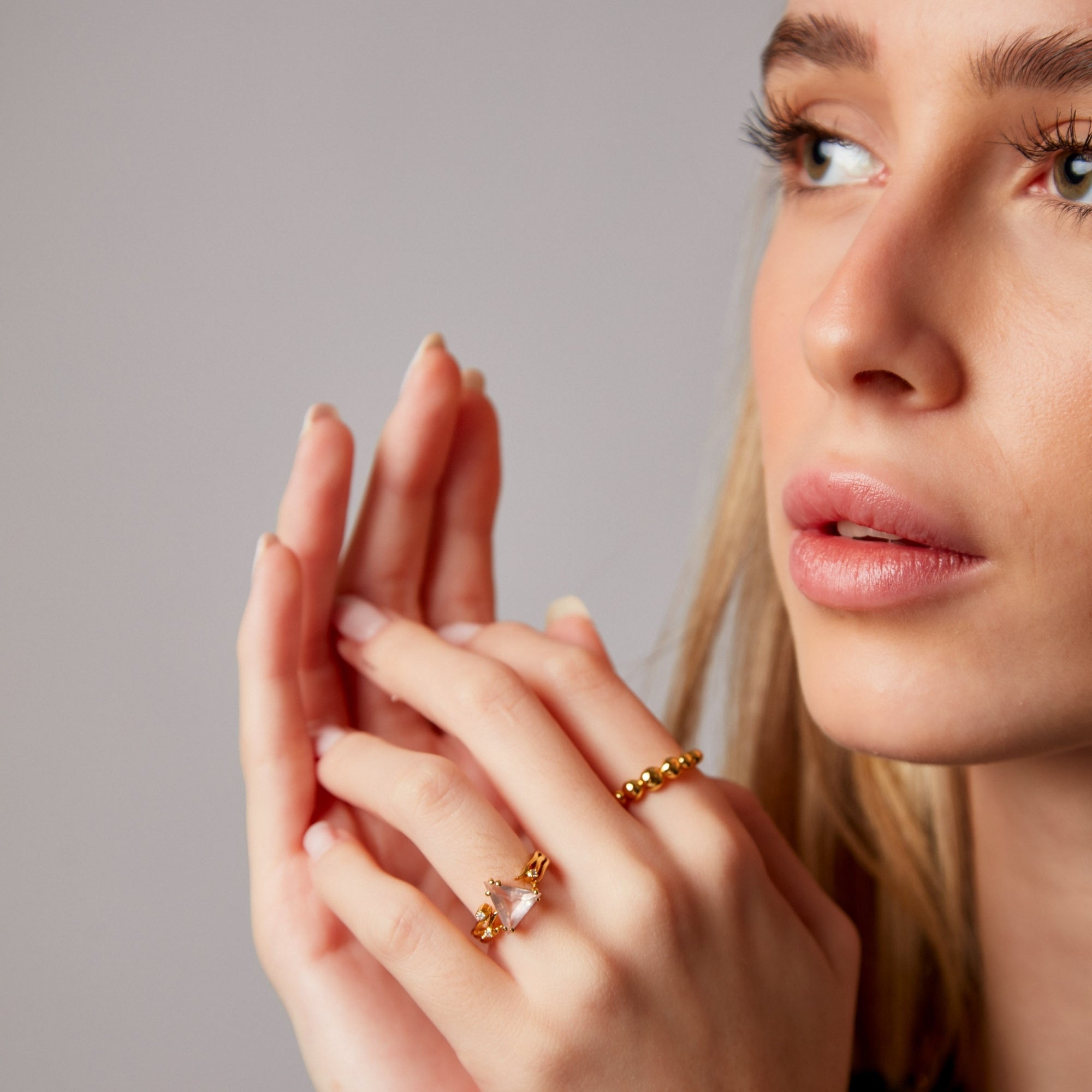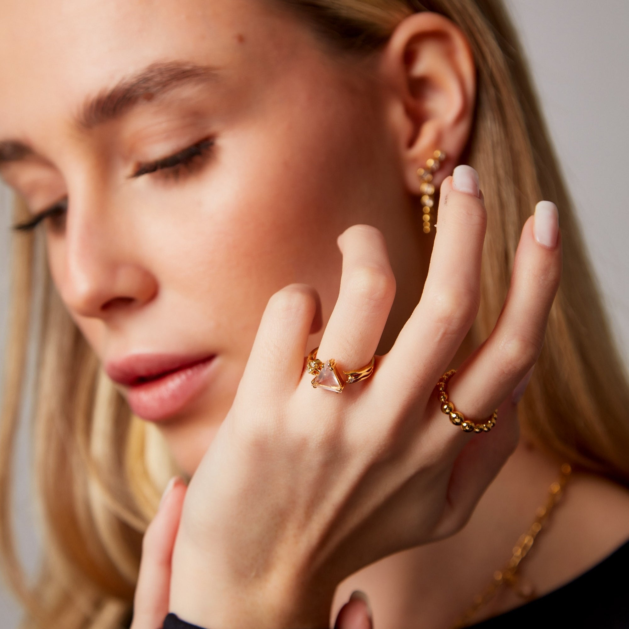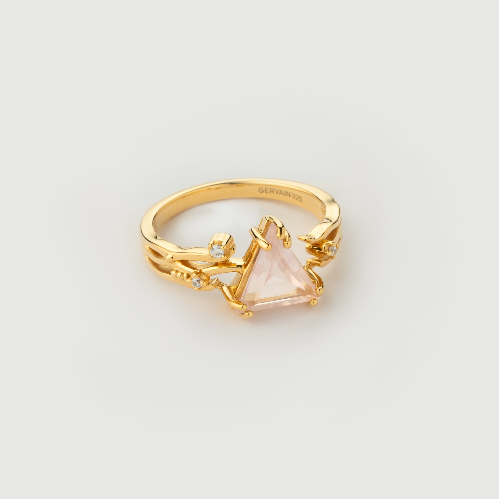 The "Riva" Yellow Gold Ring with Natural Rose Quartz impresses with its captivating design, which juxtaposes the perfect shape of the natural rose quartz with the irregular, almost organic profile of the metal mount. This unique combination creates the illusion that the stone floats above the ring, giving it a touch of contemporary elegance. Plated with 18k yellow gold, according to the French "Vermeil" standard, the ring combines sophisticated aesthetics with remarkable durability.