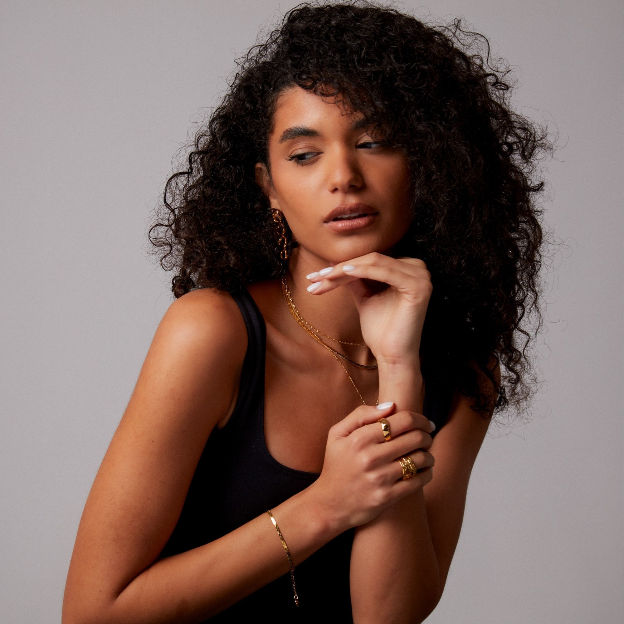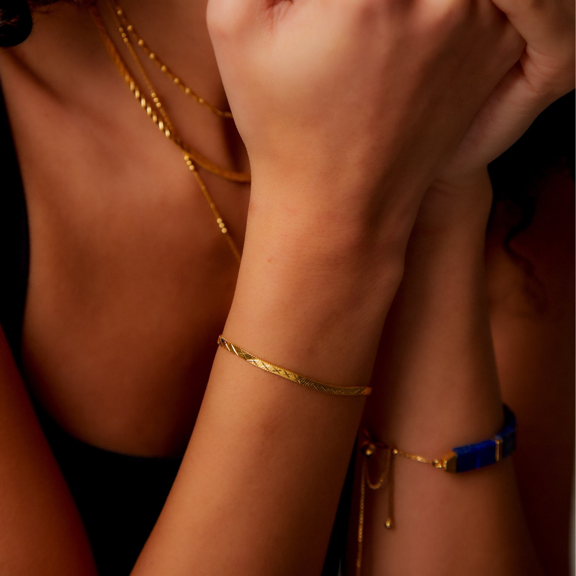 This textured chain bracelet is the perfect balance between elegance and versatility. Its refined and intricate design makes it ideal to be worn alone or combined with other accessories, adding a touch of style to any outfit, whatever the occasion. 18k yellow gold plating provides a luxurious finish, highlighting the beauty of the masterfully crafted details.