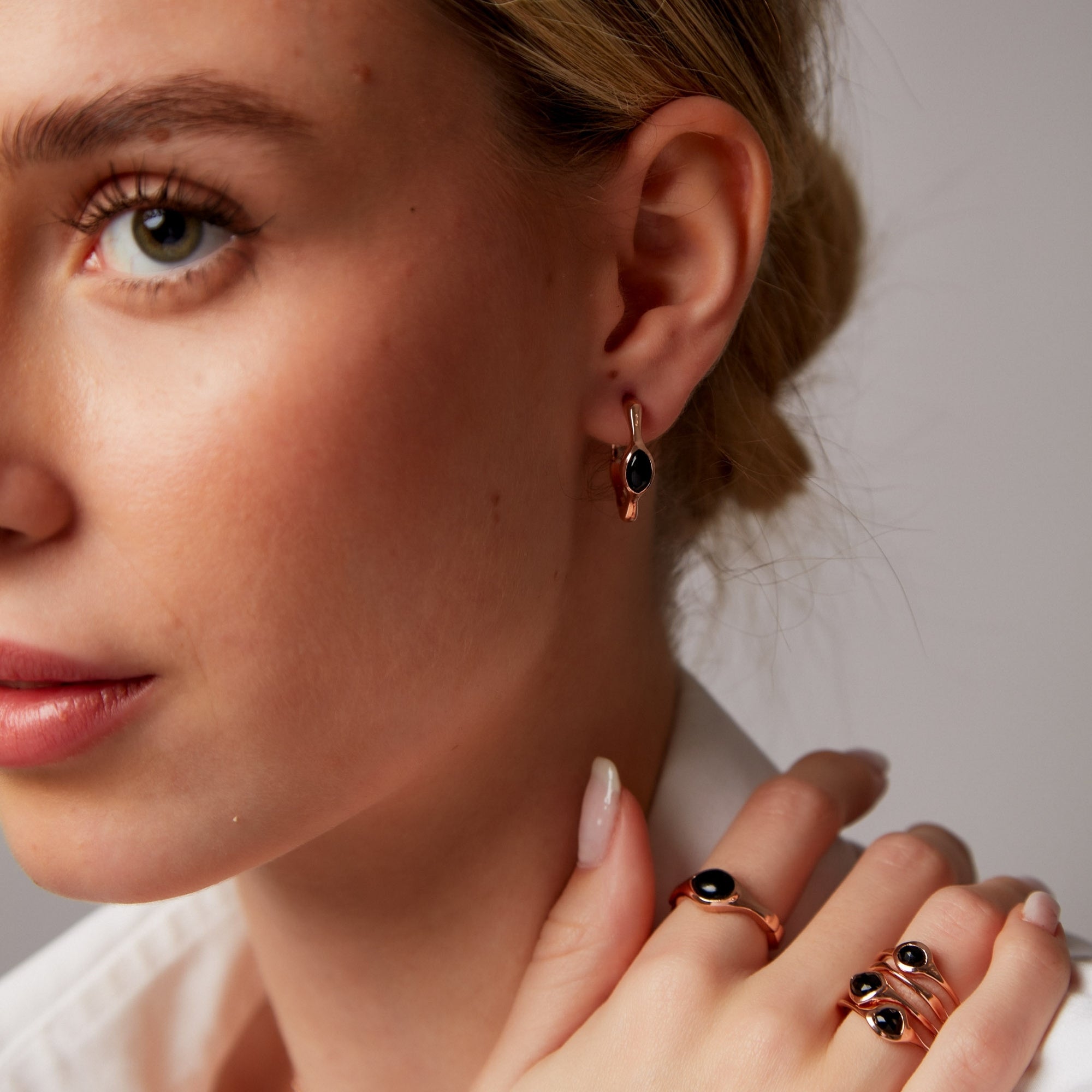 Inelul "Lima" se remarcă prin designul său spectaculos, cu forme organice ce inspiră liniște și echilibru interior. Decorat cu onix negru natural, această bijuterie adaugă o notă de mister și eleganță subtilă. Placat cu aur roz de 18k, conform standardului francez "Vermeil", inelul combină estetica modernă cu o durabilitate de excepție.