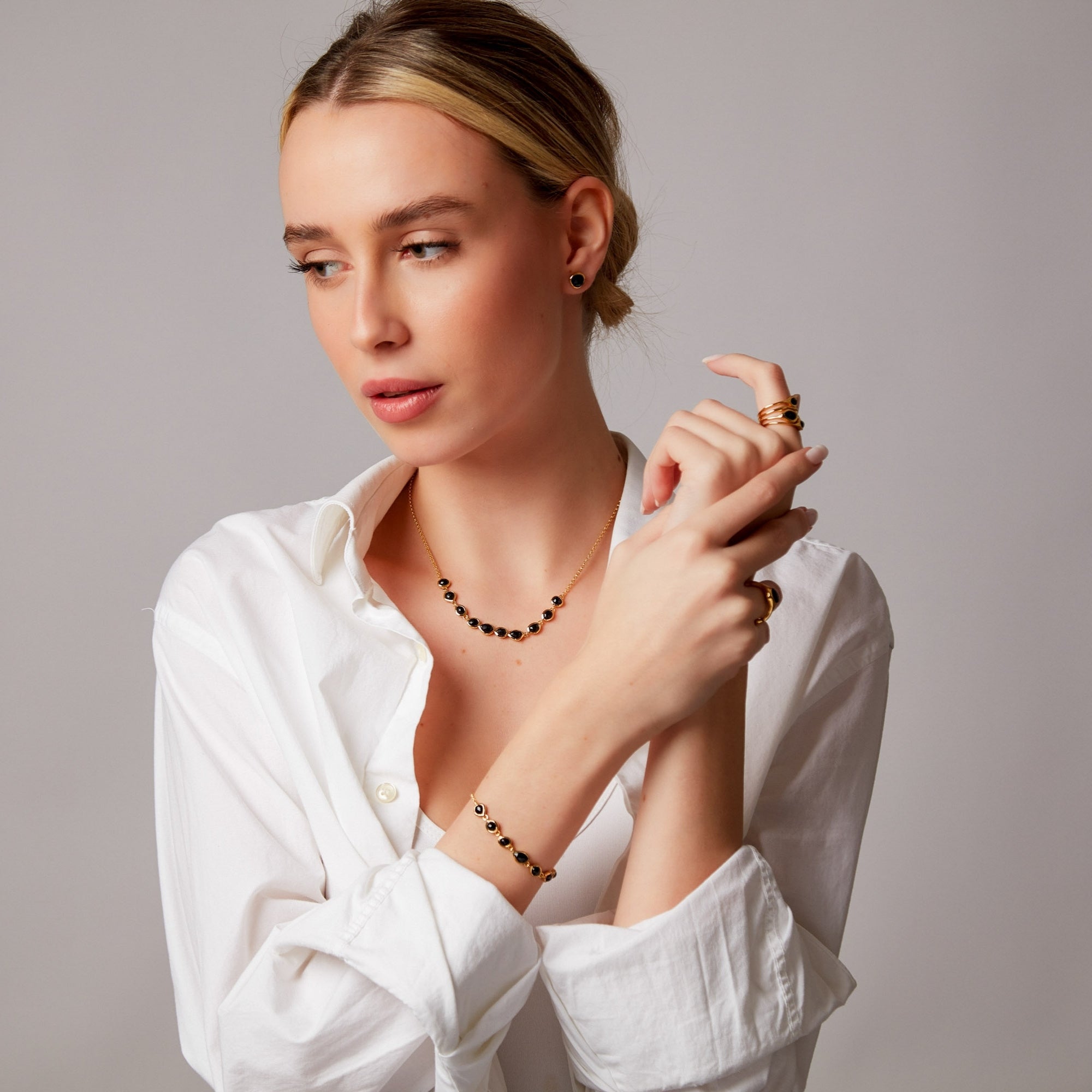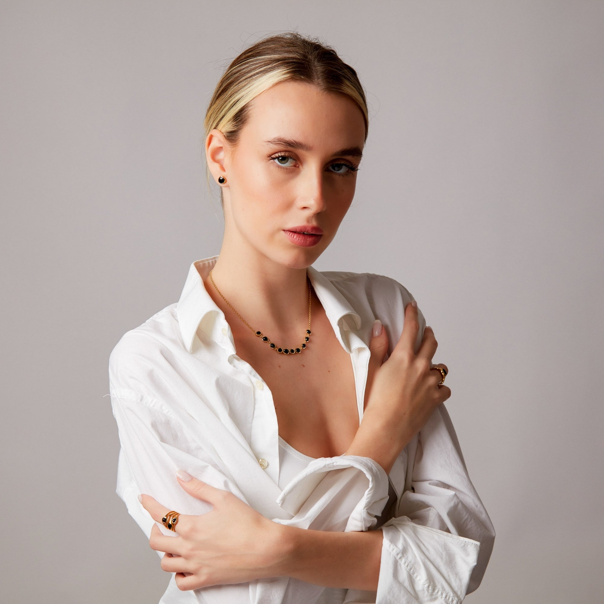 Inelul "Satta" impresionează prin eleganța sa clasică și misterul oferit de onixul negru natural, șlefuit cu grijă pentru a reflecta o strălucire discretă și sofisticată. Placat cu aur galben de 18k, conform standardului francez "Vermeil", acest inel adaugă un accent rafinat oricărei ținute.