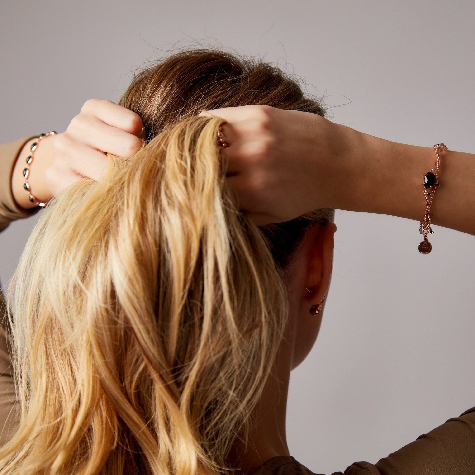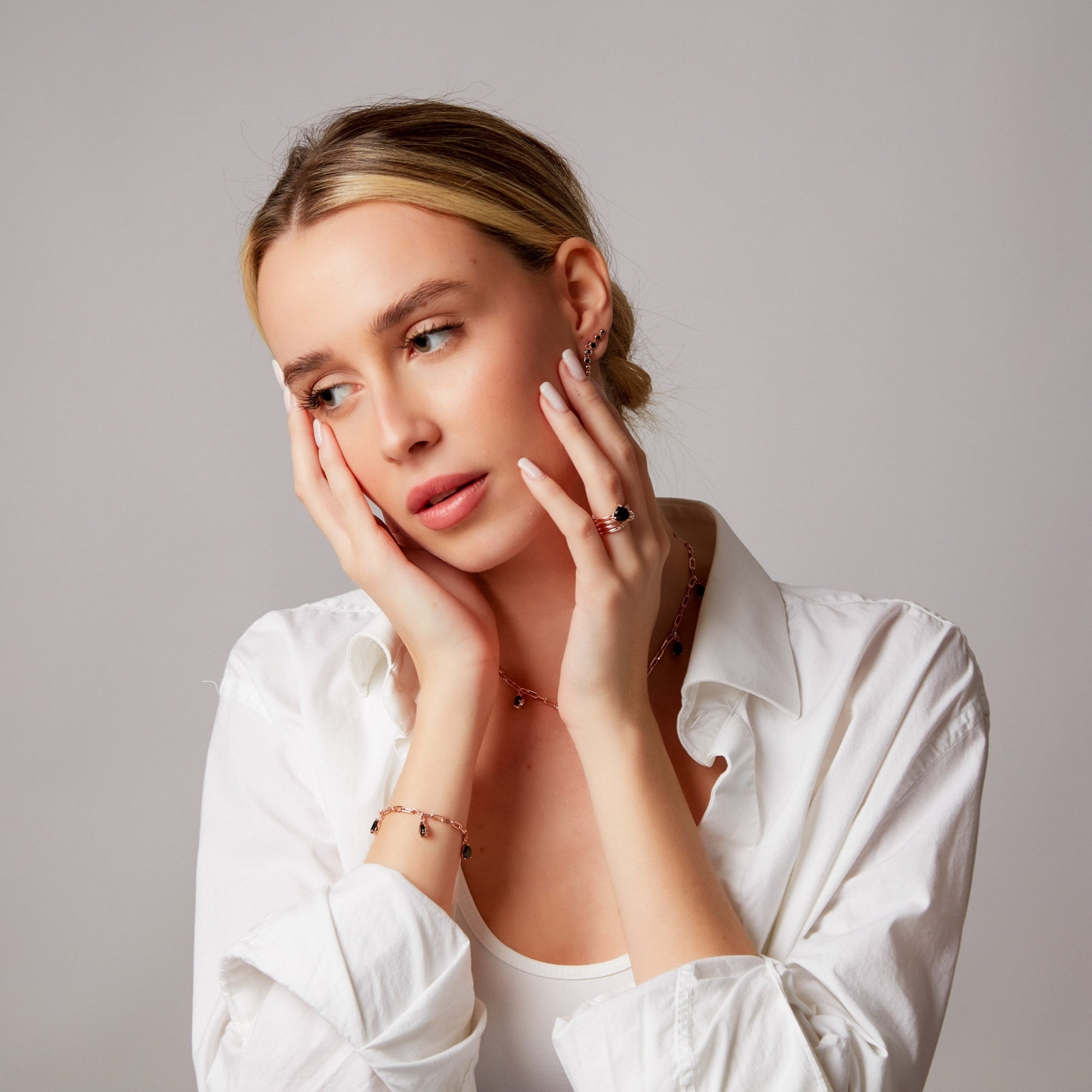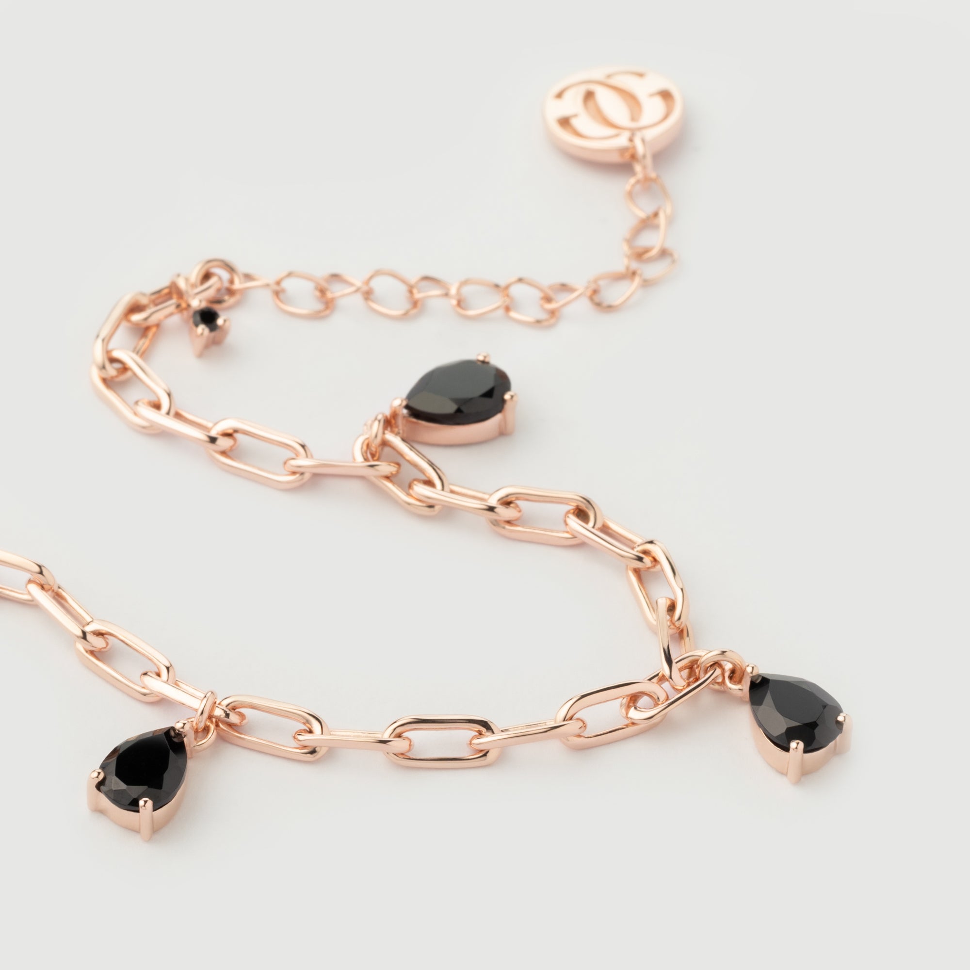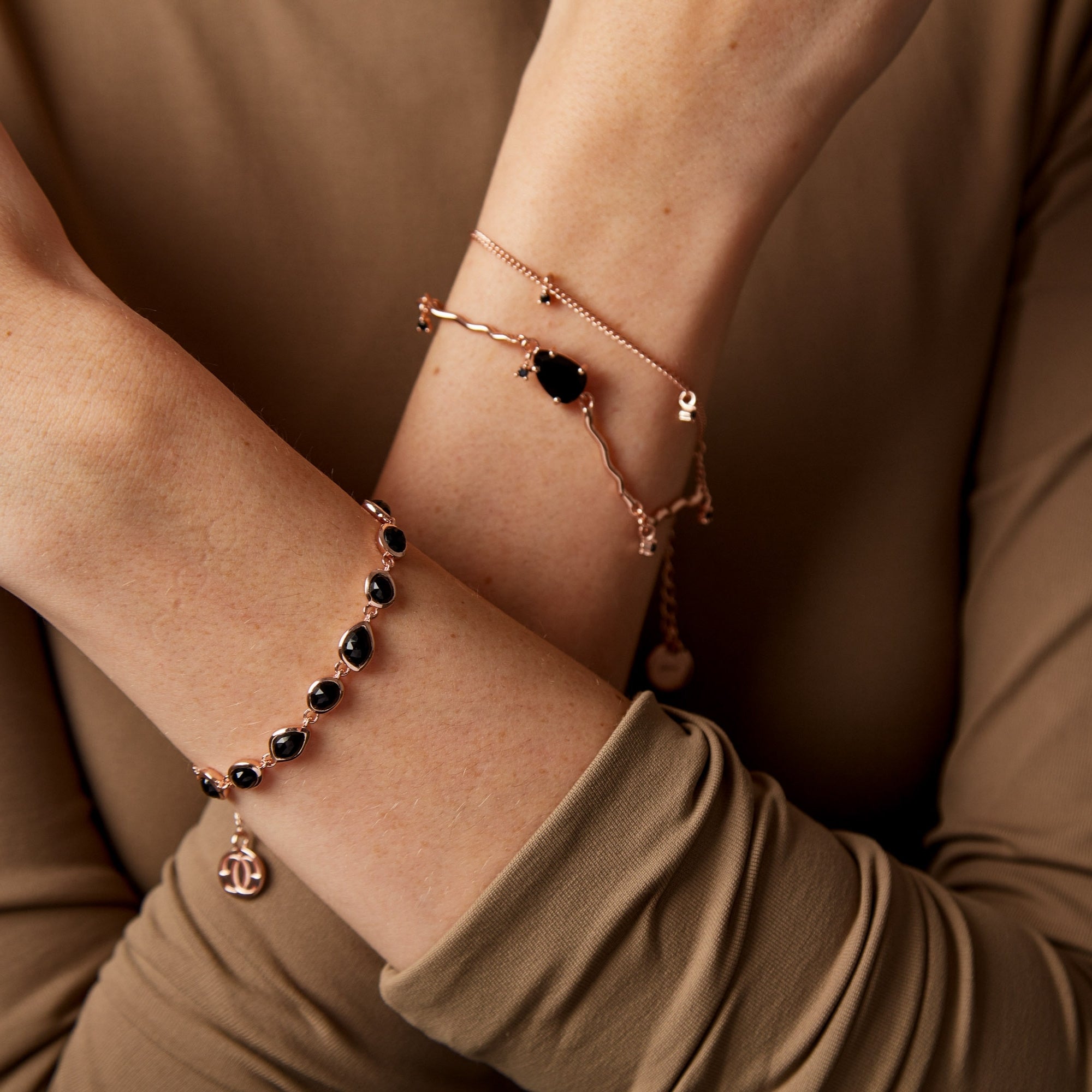 Brățara "Haze" impresionează prin combinația unică de aur roz și onix negru natural, oferind străluciri diferite în funcție de lumina din jur și atrăgând privirile în orice context. Această piesă rafinată este perfectă pentru a adăuga o notă de eleganță și mister oricărei ținute, fie că este purtată la ocazii speciale sau în viața de zi cu zi.